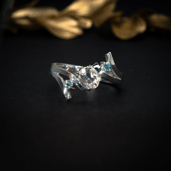 Anillo de compromiso con topacio natural corte oval y cristales laterales elaborado en plata .925